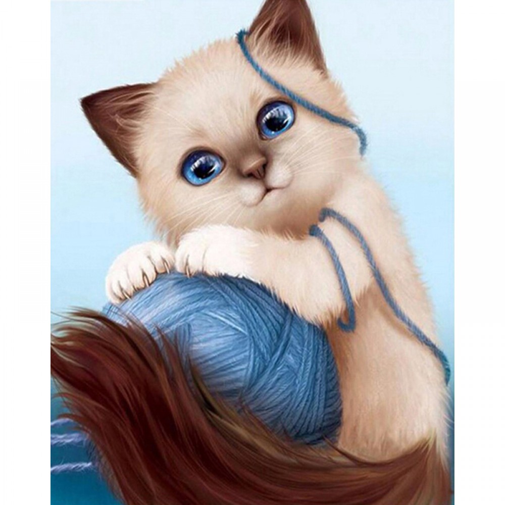 Ψηφιδωτό Μωσαϊκό με ψηφίδες τύπου διαμαντάκια και σχέδιο ένα γατάκι που παίζει με μπλε κουβάρι , 30cm x 40 cm.
