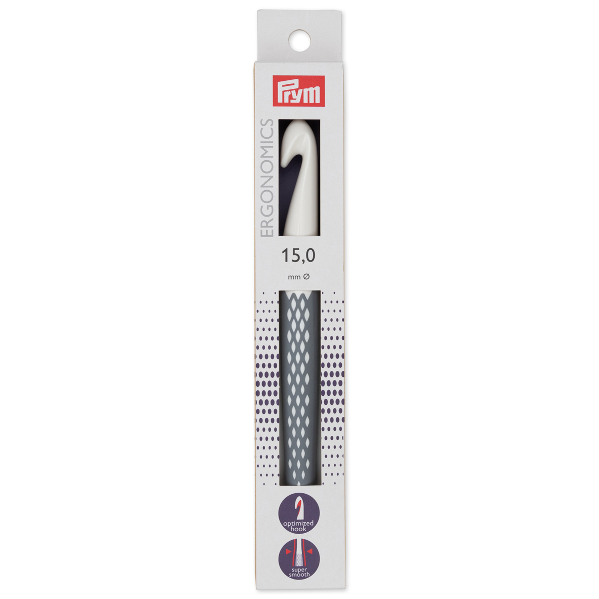 Τα έγχρωμα βελονάκια για μαλλί prym.ergonomics είναι κατασκευασμένα από ειδικά πλαστικά υψηλής ποιότητας και επομένως διατίθενται σε λεπτά ή χοντρά, που κυμαίνονται από 3 mm έως 15 mm. Εξασφαλίζουν ότι μπορείτε να εργάζεστε αβίαστα, χωρίς καταπόνηση στους καρπούς και να είναι άνετα στην υφή. Ο γυαλιστερός άξονας επιτρέπει στις βελονιές να γλιστρούν εύκολα, ενώ το εργονομικό σχήμα της αντιολισθητικής πλαστικής λαβής διασφαλίζει ότι απολαμβάνετε ευχάριστο βελονάκι χωρίς κόπωση. Οι λαβές σε διάφορα φρέσκα χρώματα σάς βοηθούν να προσδιορίσετε το απαιτούμενο νούμερο, ώστε το βελονάκι να μπορεί να ανακτηθεί γρήγορα από το καλάθι εργασίας σας. Το 2014 κέρδισαν το Red Dot Design Award.