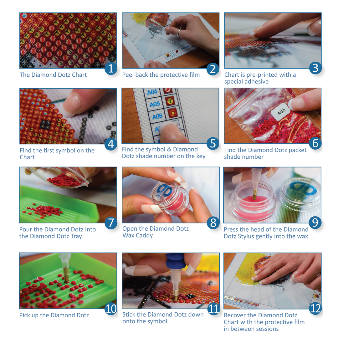 Δημιουργήστε αστραφτερά έργα τέχνης με τις χρωματιστές ψηφίδες Diamond Dotz, τοποθετώντας τες με το ειδικό 'στυλό' στην κολλώδη επιφάνεια του πίνακα.